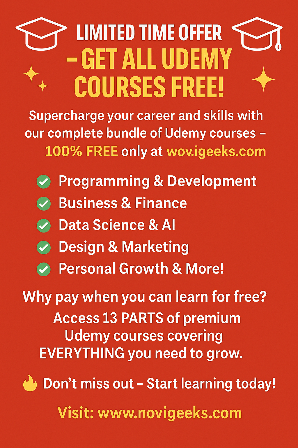 🎓✨ LIMITED TIME OFFER – GET ALL UDEMY COURSES FREE! ✨🎓 🚀 Supercharge your career and skills with our complete bundle of Udemy courses – 100% FREE only at 👉 www.novigeeks.com ✅ Programming & Development ✅ Business & Finance ✅ Data Science & AI ✅ Design & Marketing ✅ Personal Growth & More! Why pay when you can learn for free? 📚 Access 13 PARTS of premium Udemy courses covering EVERYTHING you need to grow. 🔥 Don’t miss out – Start learning today! 👉 Visit: www.novigeeks.com